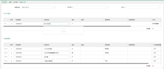 在新建生產單時,選擇成品與原料可通過選擇生產BOM來快捷選擇。