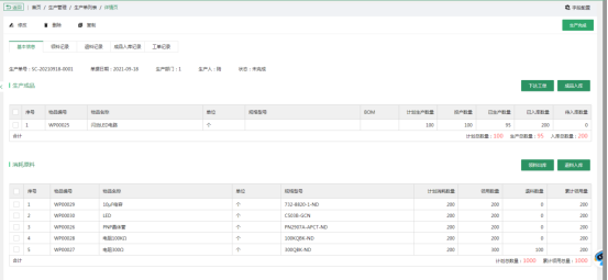 在生產單列表,會顯示全部生產單。在生產單詳情界面,可實現(xiàn)領料、退料、產成品入庫并可快速流轉生成派工單。